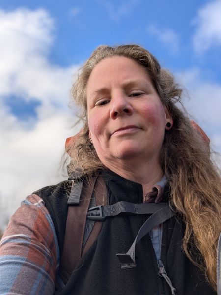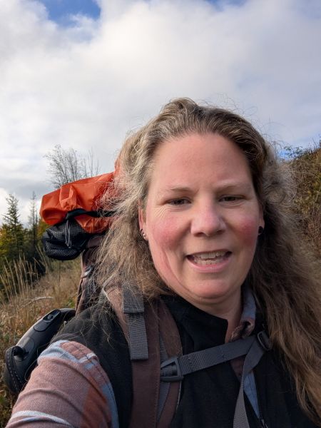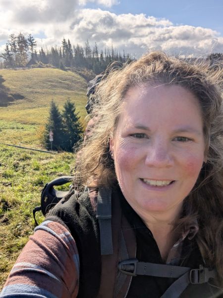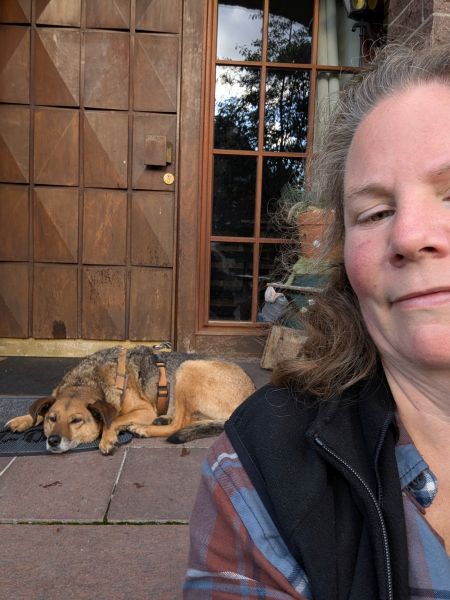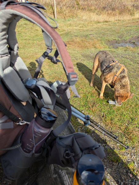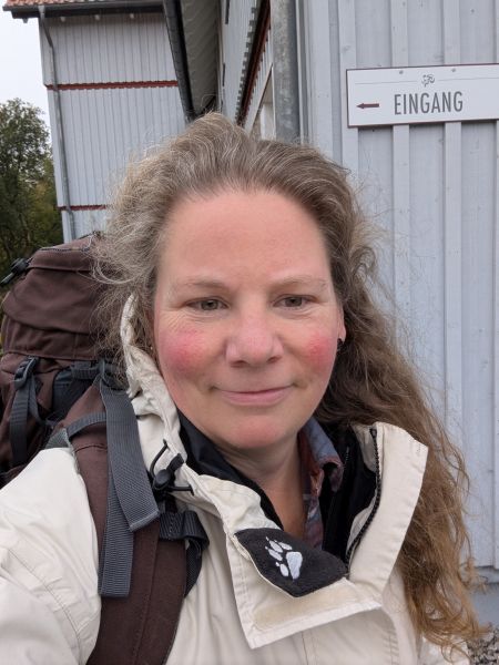 Eine kurze Rast an der Huttaler Widerwaage nutzte ich, um die Jacke auszuziehen. Sie war pitschnass von innen. Zunächst dachte ich ja, dass ich so geschwitzt habe. Aber es war wohl doch auch die Mischung mit dem Regen. Dicht ist was anderes. 🙁 Es gab etwas Trockenfutter für Mona und einen Stempel in meinen Wanderpass für mich.