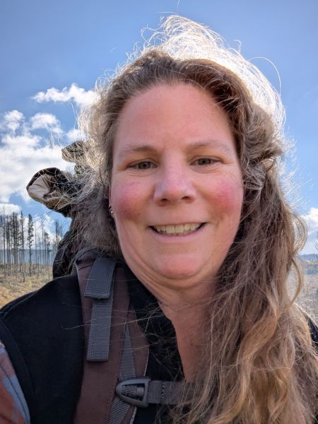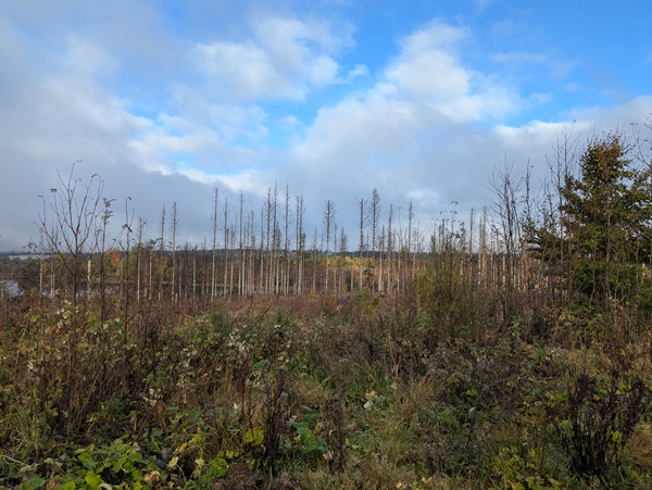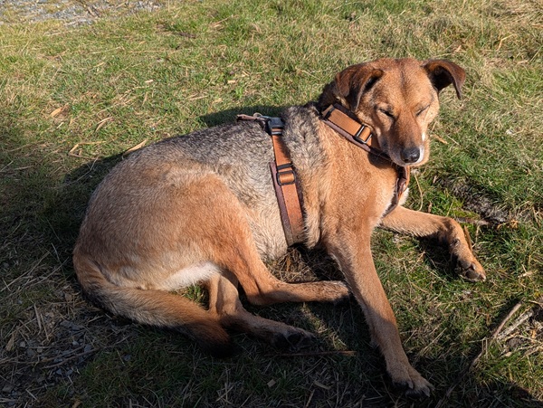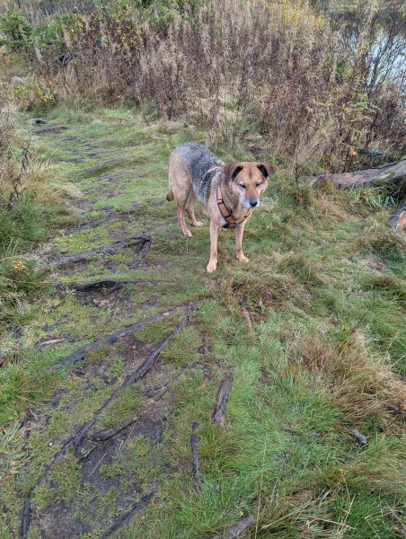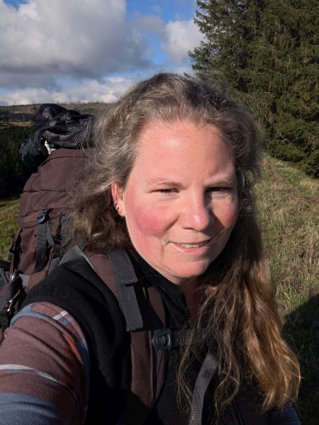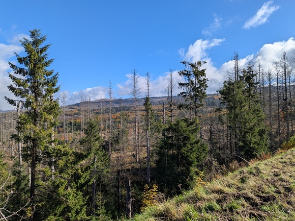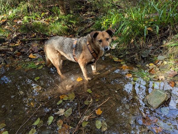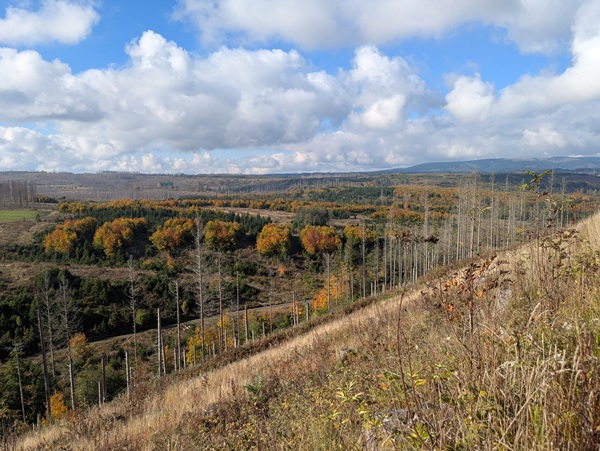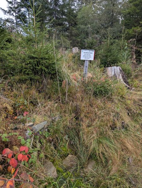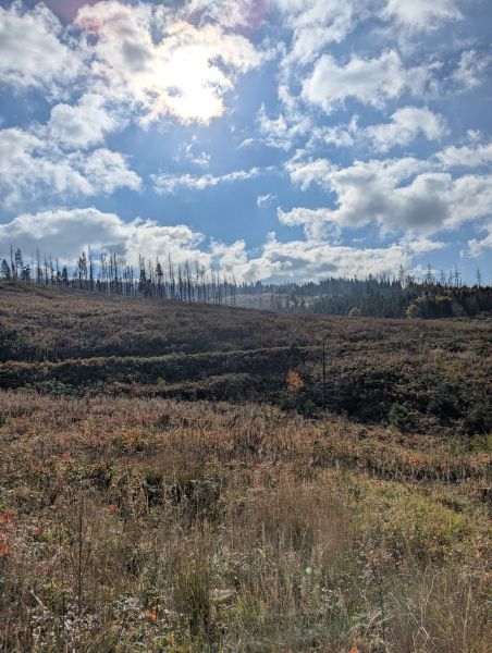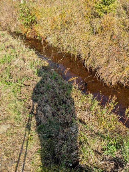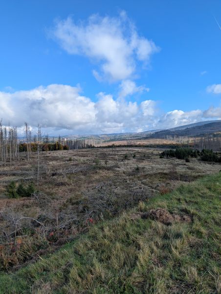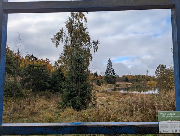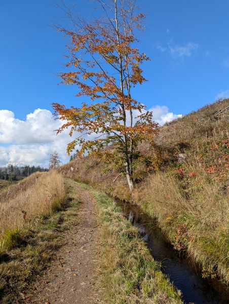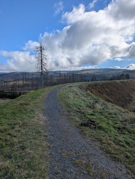 Die B498 müssen wir queren, das ist auch kein Problem und dann rasten Mona und ich an einer Bank kurz vor der Eisenquelle in der Sonne. Das tut uns beiden gut. Es gibt Futter und Wasser für uns zwei und wir genießen die Sonnenstrahlen. Um danach weiter in der Sonne zu wandern! Erwähnte ich schon, dass wir tatsächlich den Großteil dieser wunderschönen Etappe entlang vieler Wassergräben des Oberharzer Wasserregals in der Sonne genießen durften? Im Sommer würde ich es allerdings nicht empfehlen, denn da hier kaum noch Bäume stehen, wird es sicherlich sehr schnell sehr warm werden.