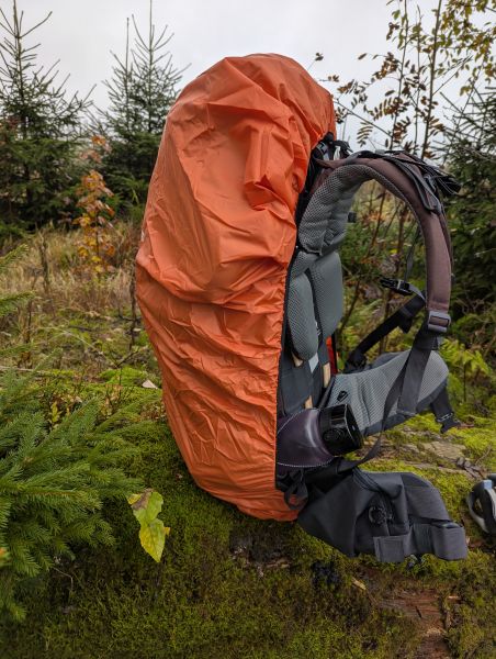 Egal, erstmal ging es wieder über den schönen Wiesenweg und siehe da, der Regen hörte auf. Doch kaum am Teich angekommen, setzte der Regen wieder ein und es wechselte ein Niesel mit stärkerem Regen, so dass ich den Rucksack wieder abgesetzt habe und meine Regenhaube ausprobieren konnte. Passt super, hält und wasserdicht war es auch.