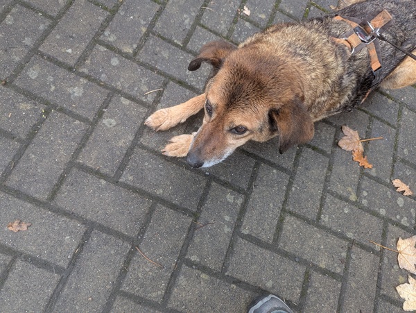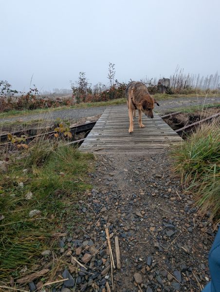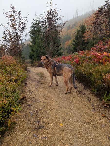 Der Rest bis Torfhaus ist unspektakulär und geht am Straßenrand über einen heute äußerst matschigen Weg entlang. Wir waren früh da und bekamen den ersten Bus mit. Mona war nicht begeistert und direkt beim Ausstieg hatte sie sich ihre Kaustange verdient.
