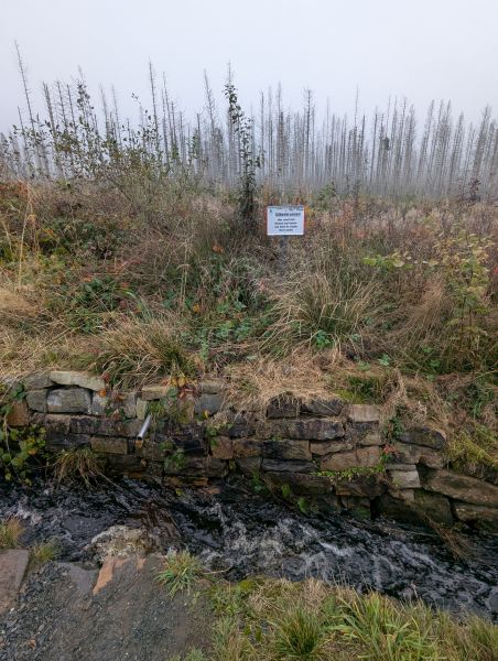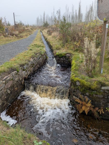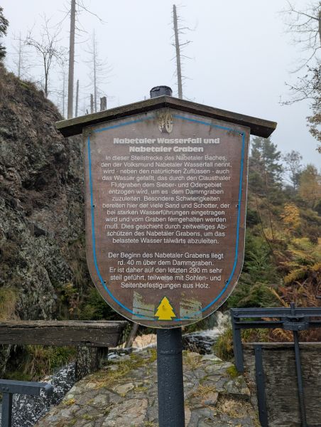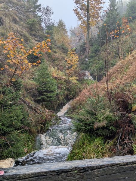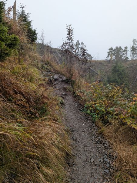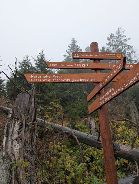 Ja, man muss schon etwas sportlich sein. Hier geht es teilweise steil bergab und dann auch wieder hoch. Über Steine, Geröll, Wurzeln, Matsch. Heute ist es rutschig. Im trockenen Sommer sicherlich alles kein Problem. Ich war froh, dass ich meine Stöcke dabei hatte. Und dann war alles wieder schön, bis… ja, bis zum Aufstieg nach Torfhaus. Auch dies sehr naturnah über Geröll und große Steine. Und ich war fix. Und fertig. Und nass. Fotos vom Weg gibt`s übrigens keine. Ich war mit Gehen beschäftigt.